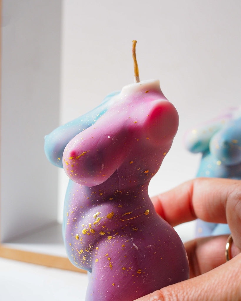 Half pink and half teal using our special ombre/marble technique plus a touch of gold splash! Check out our artist designed edition of this candle, hand made and inspired by the badass character Harley Quinn.