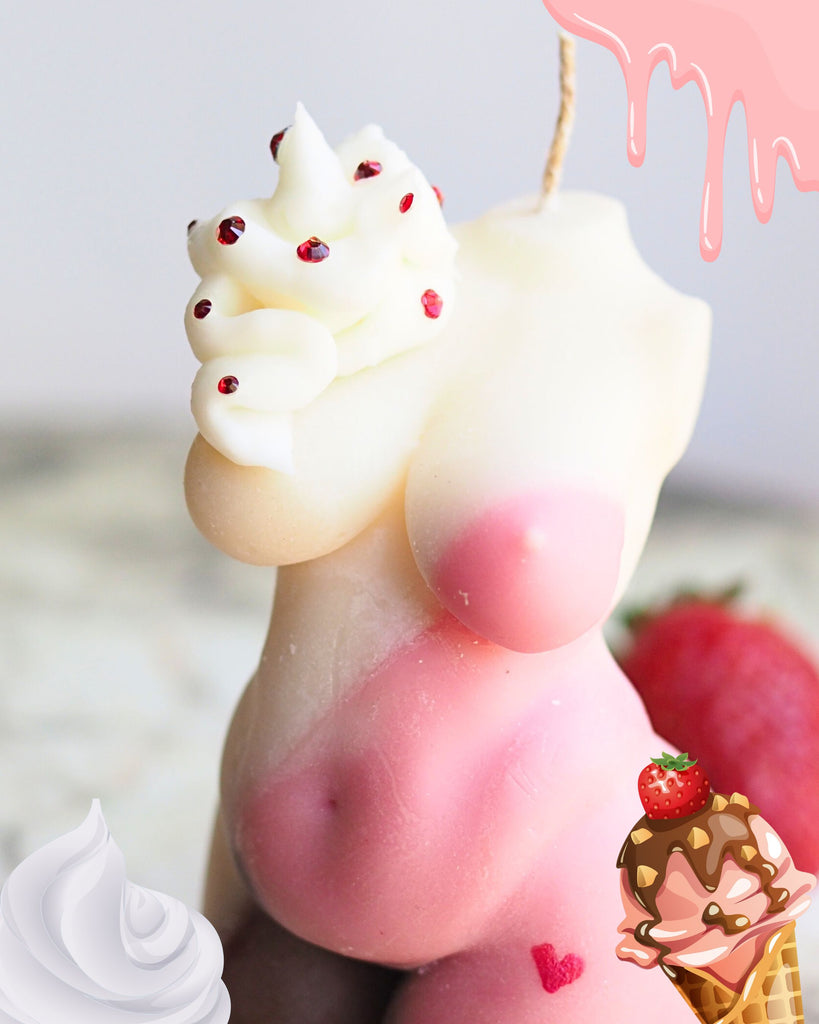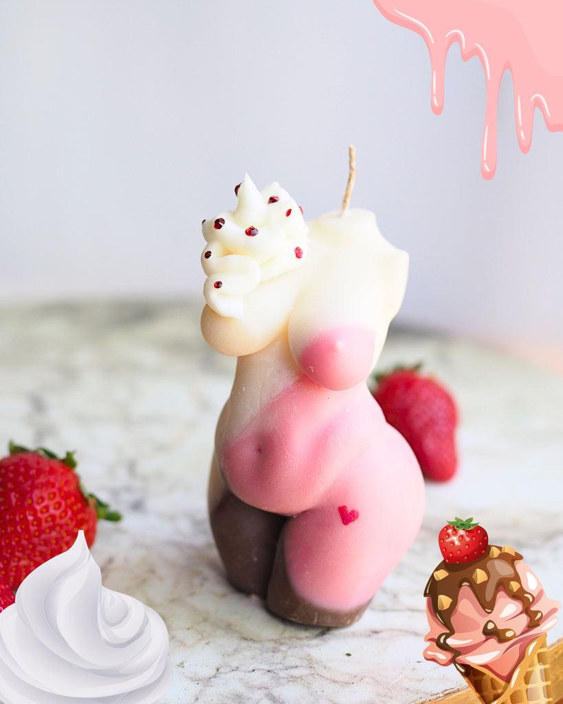 Color: Indulge your senses with the Neapolitan Ice Cream Becca Candle, expertly hand crafted to present the vibrant colors of vanilla, chocolate, and strawberry topped with a hint of whipped cream and cherry glass crystals. This body-shaped candle not only adds a playful aesthetic to your space but also fills the room with a deliciously inviting scent, perfect for creating a cozy and comforting atmosphere. Ideal for those who appreciate unique, gourmet-inspired candle art!