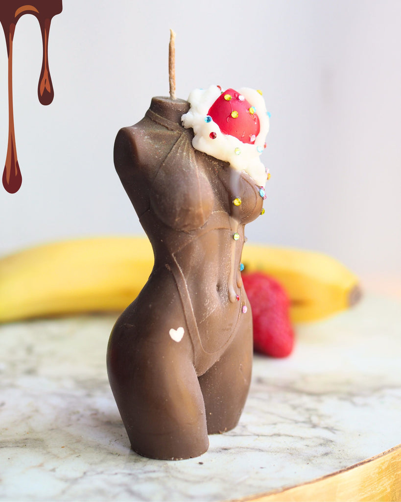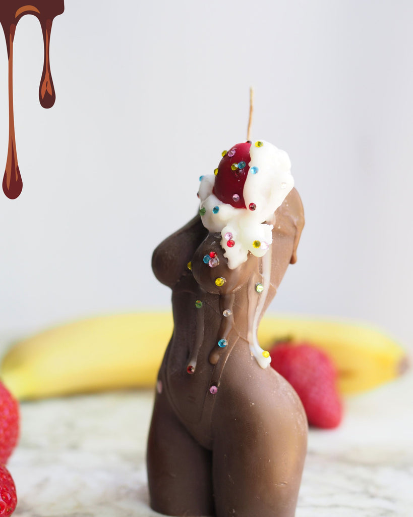 Rich chocolate colored wax, hand whipped wax cream and a vibrant wax cherry with rainbow crystal sprinkles. I hand torch the wax to give it a slightly melted look for that oh so sexy drip. My signature heart tattoo on her hip bone and of course free customizations! Choose from a belly ring or a hand painted name on her upper booty cheek. Packaged in a cute ice-cream box!