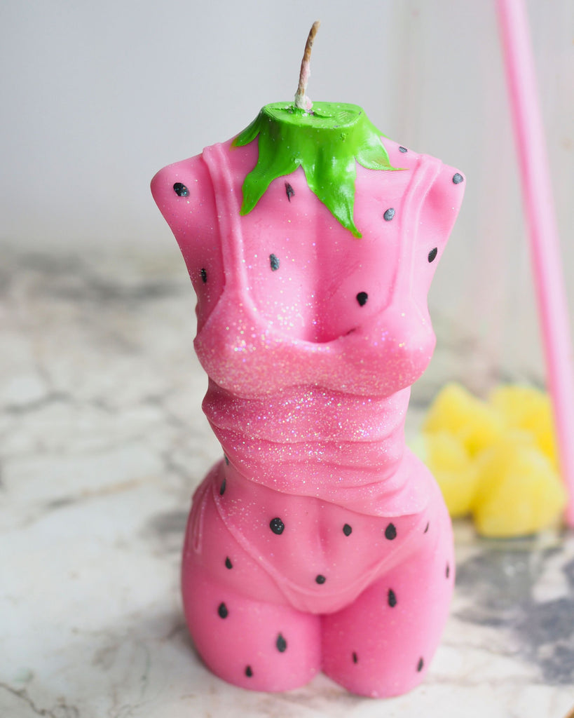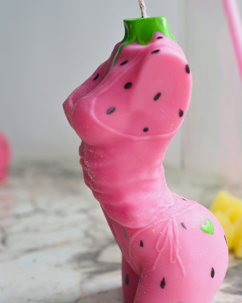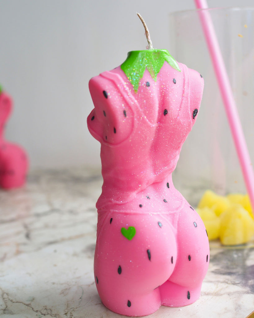 Color: Strawberry Jenny is the cutest sexy strawberry candle you'll ever own! Fun and lively, vibrantly pink with handpainted green leafs and green heart tattoo on her booty.