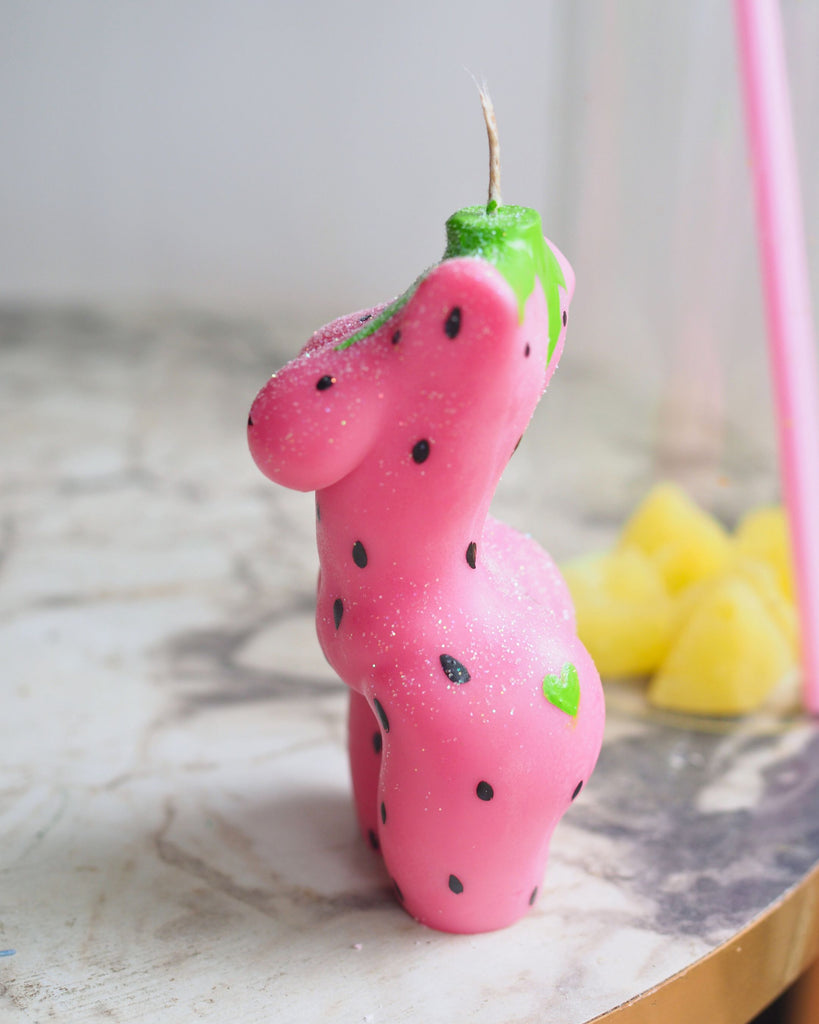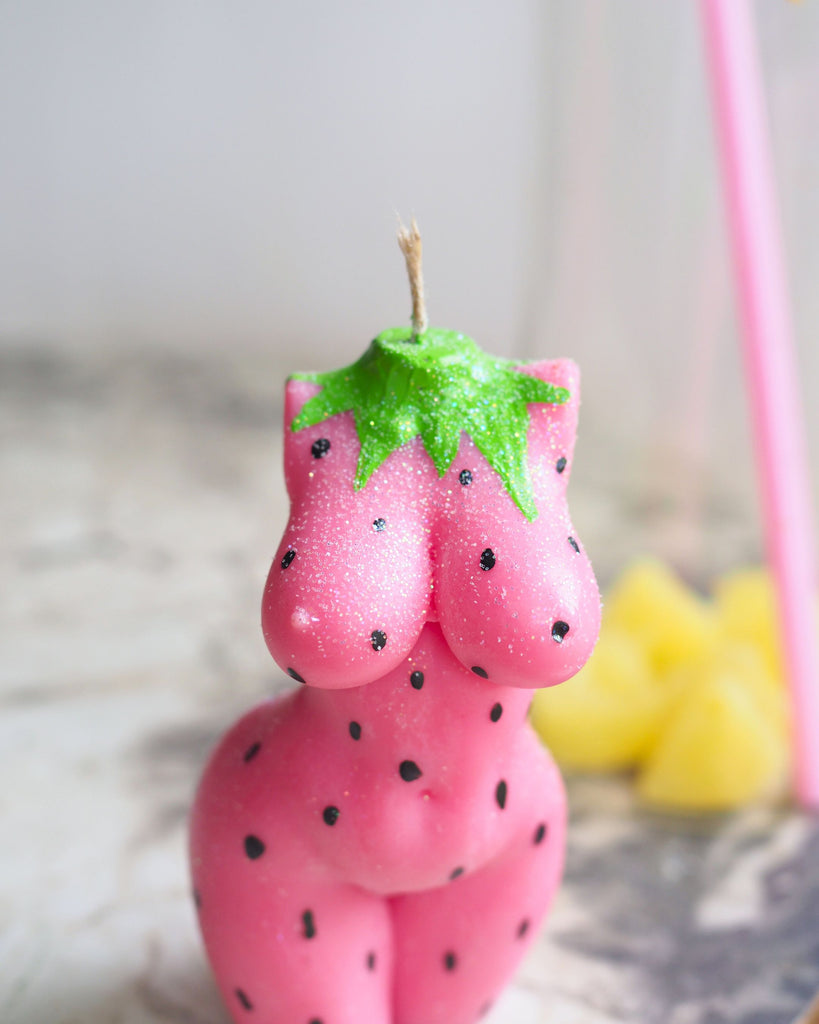 Color: Strawberry Jenny is the cutest sexy strawberry candle you'll ever own! Fun and lively, vibrantly pink with handpainted green leafs and green heart tattoo on her booty.