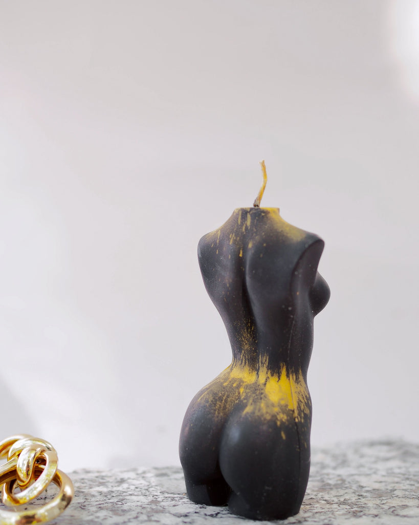 Signature Black Gold: is hand made and found through experimentation with water and shimmer. The candle is solid wax but the water around it causes the effects of marble when used with shimmer.