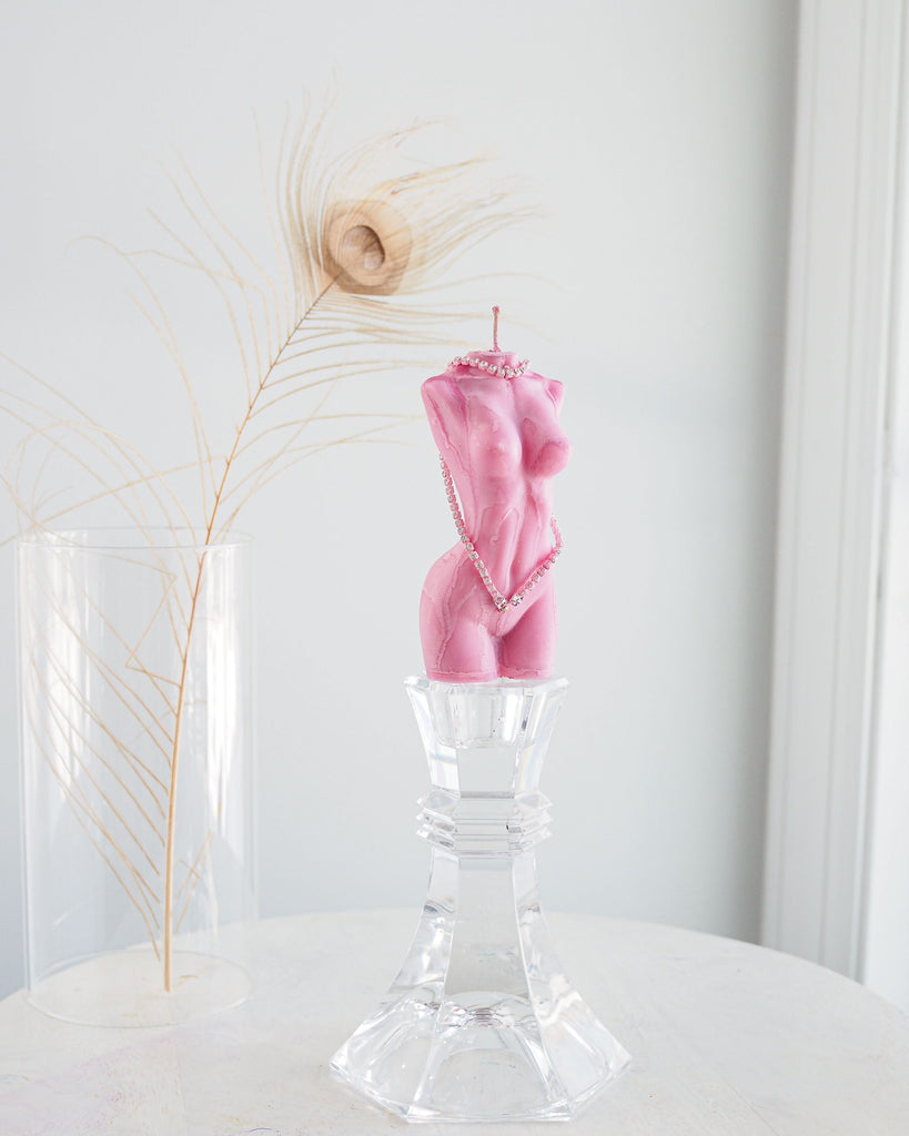 Our signature satin pink wax with a pearl pink matte drip finish and custom pink crystal chain is a dream!