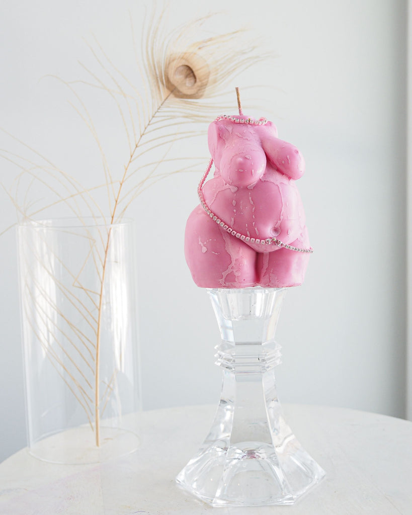 Our signature satin pink wax with a pearl pink matte drip finish and custom pink crystal chain is a dream!