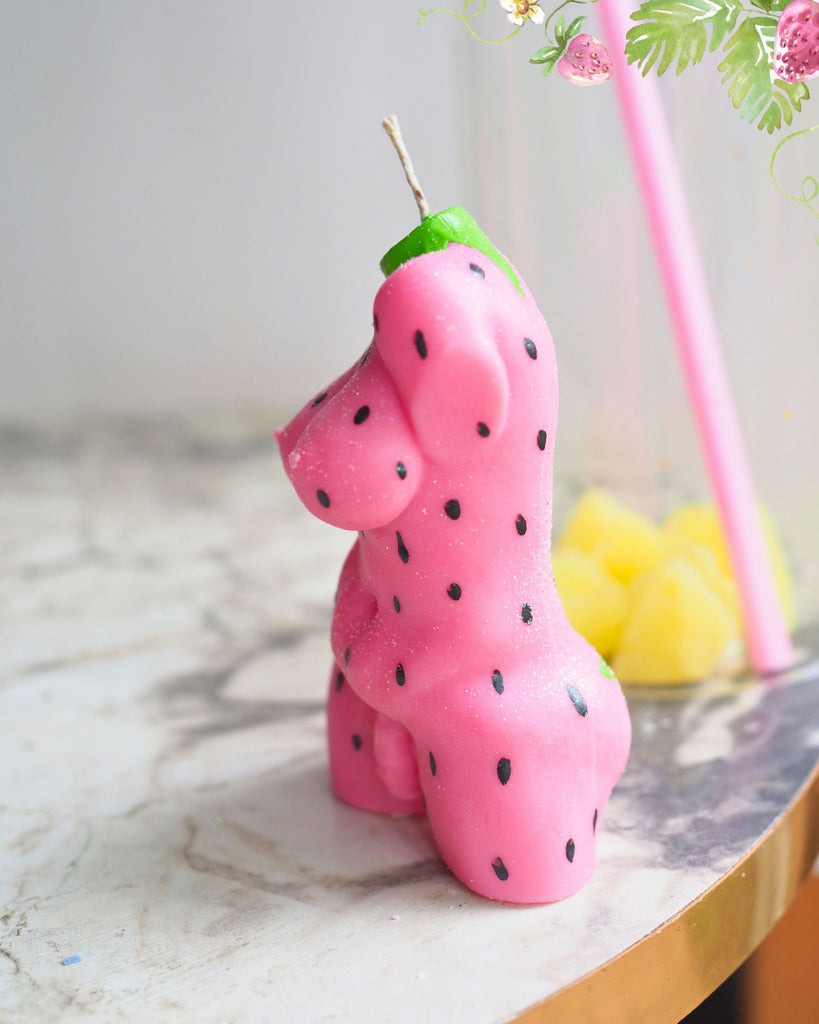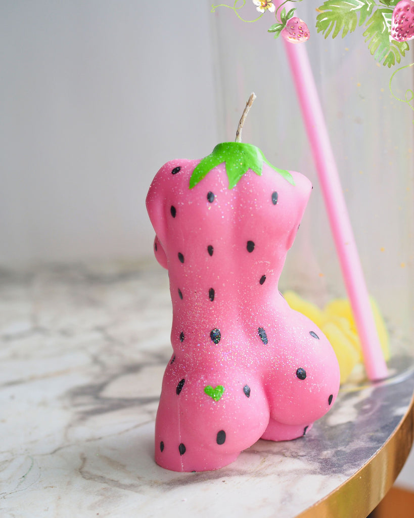 Color: Strawberry Jenny is the cutest sexy strawberry candle you'll ever own! Fun and lively, vibrantly pink with handpainted green leafs and green heart tattoo on her booty.