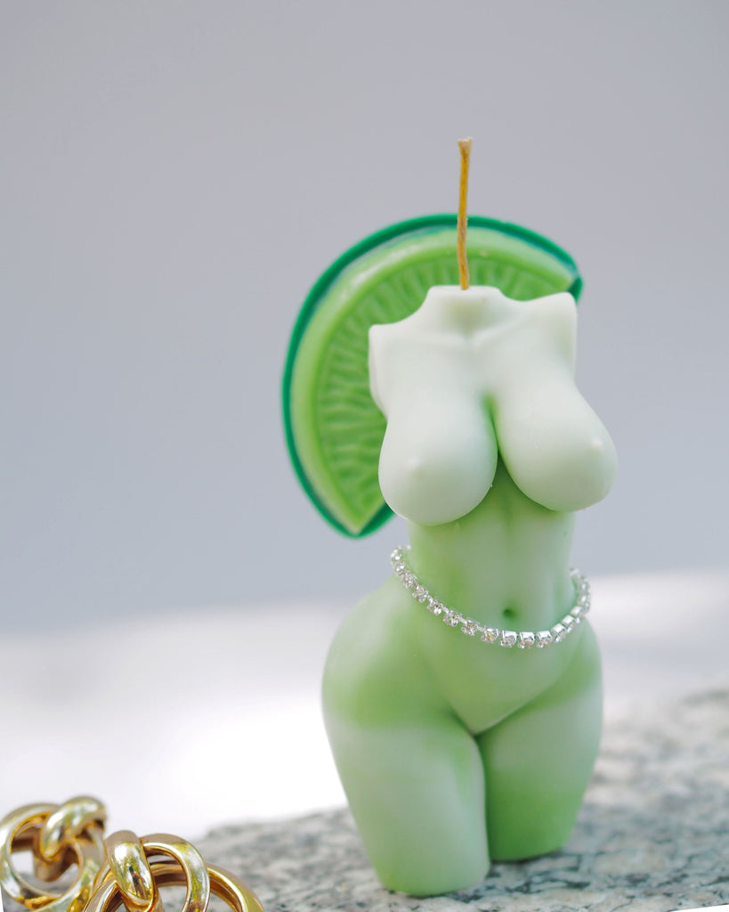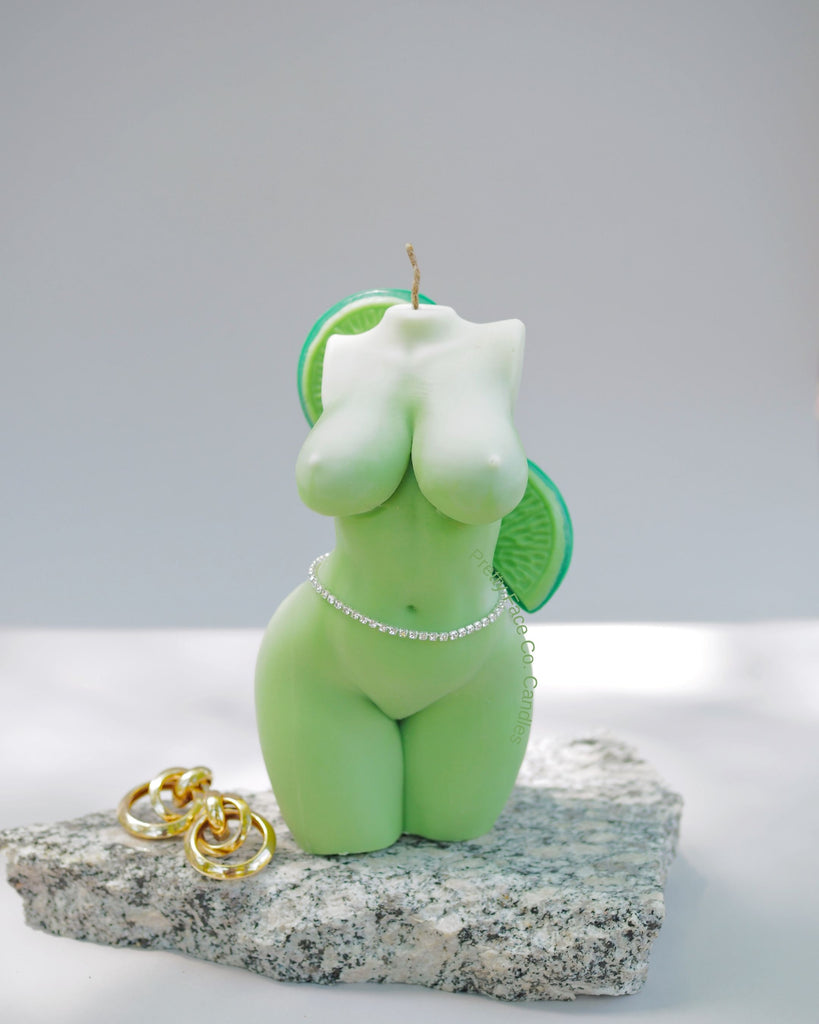 Inspired by the refreshing salty lime tequila drink claimed to have been made to please Danny's girlfriend in Tehuacán Mexico, our Sparkling Margarita candle brings just the right amount of fun, sexy, smelly good eye candy to your home mini bar. Featuring a white rhinestone belly chain that represents the salt around the rim of the glass, special lime colored wax with a ombre finish plus a lime wax melt that is semi-permanently adhered to the body.