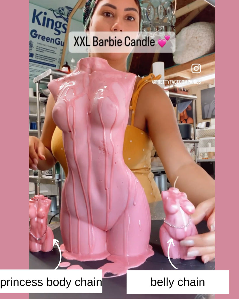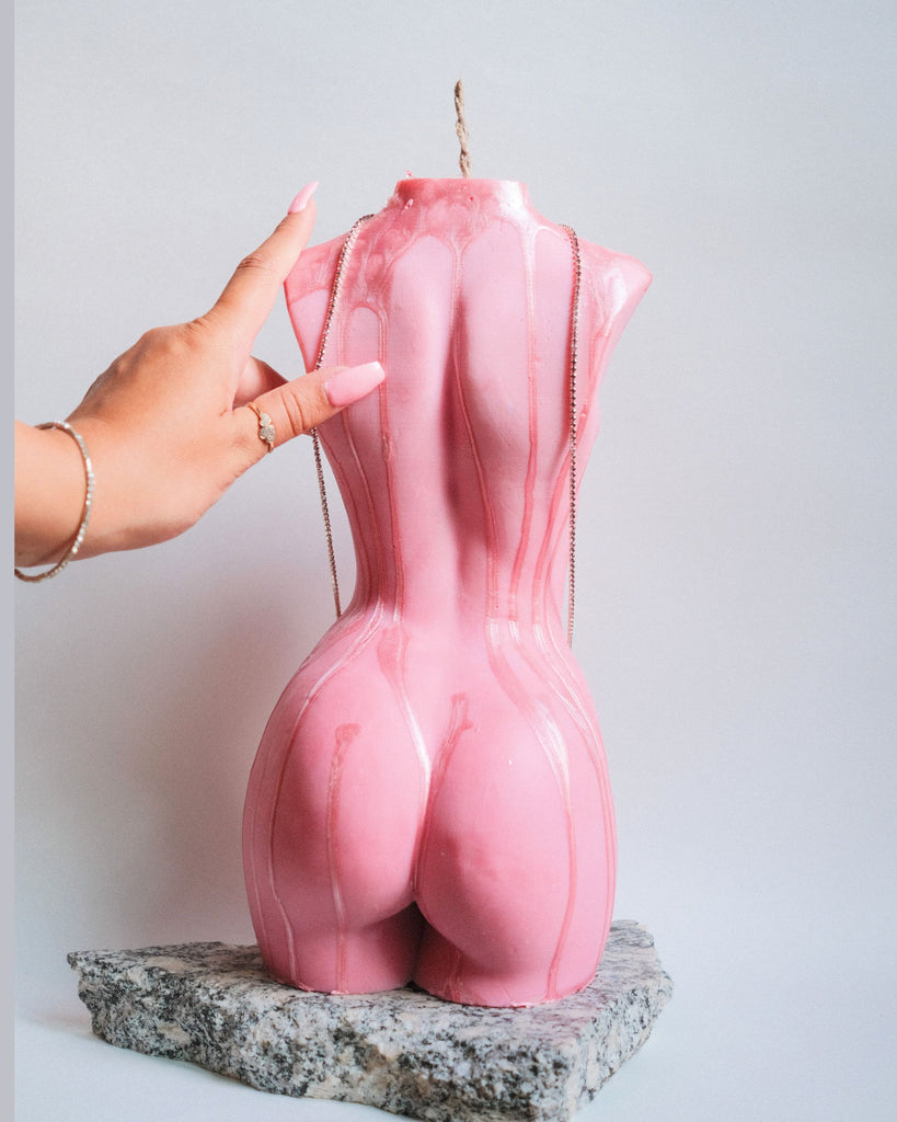 Our signature satin pink wax with a pearl pink matte drip finish and custom pink crystal chain is a dream!