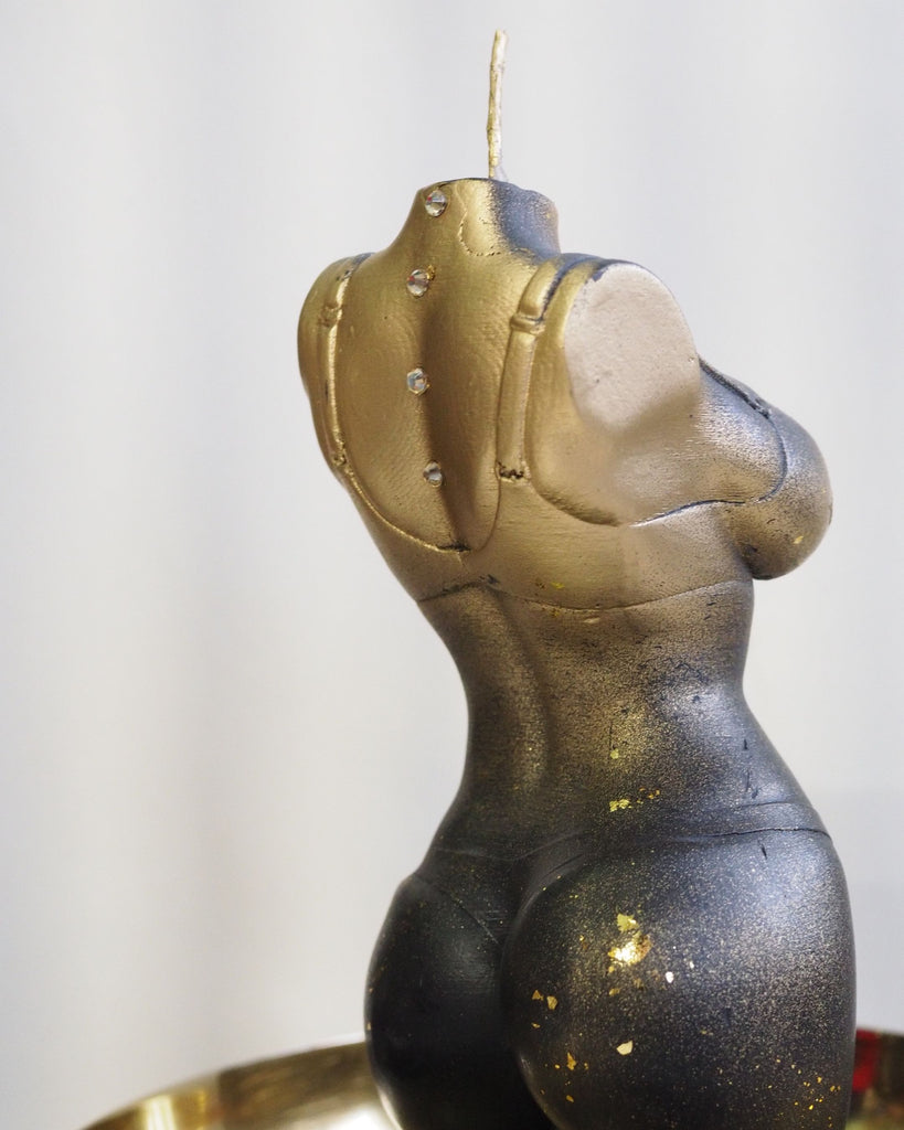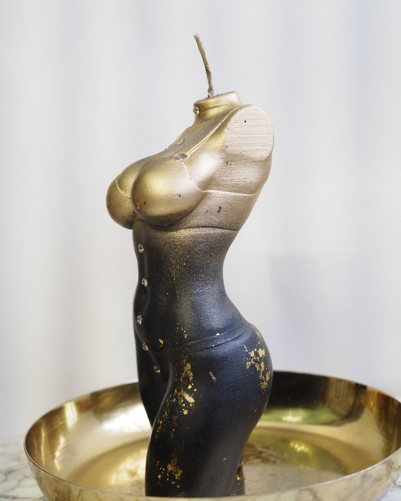 A reverse version of my Eternal Noir design that highlights the top of the candle. The gold softly melts down the body for a sexier version and eye catching details. A touch of gold flakes and some have golden glass rhinestones down the center.